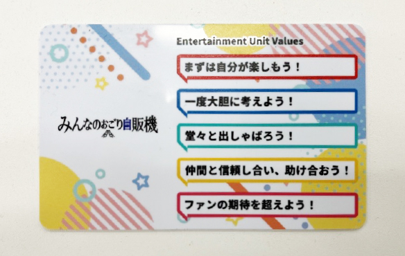 Bandai Namco Entertainment has launched the Minna-no-Ogori (treat for you from everyone) Vending Machine initiative with the aim of promoting communication among employees. The Minna-no-Ogori Vending Machine is a unique vending machine where two employees can receive a free beverage if they touch a dedicated card to the vending machine’s sensor at the same time. This initiative was started with the hope that the vending machine will provide opportunities for employees to talk to each other. In addition, we are promoting interaction among employees through various measures, such as regularly holding Tsunaga (let’s connect) Lobby, a communication event where employees can gather and interact.